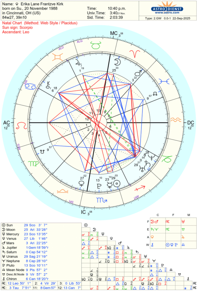 En kvinnlig Skorpion torde vara snygg och framför allt ha intensiva eller påfallande vackra ögon, och det har Erika Kirk. Den veneriska kraften, Venus, är emellertid inte tillsammans med det inre jaget (solen) och känslan för utbyte och intelligens (Merkurius) i hemligheternas tecken (Skorpionen) utan i det moraliska övervägandets tecken (Vågen). Erika älskar moralisk balans och spetsar öronen inför motsägelsefulla och komplicerade rättvisefrågor. Hjärtat och hjärnan, liksom även intuitionen och känslan för död, är i hemligheternas tecken men det intima och sinnet för skönhet verkar som starkast i det moraliska övervägandets tecken.