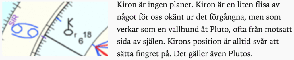 Kiron är visserligen placerad i den olympiska höjden, men är ju osynlig, så den registreras inte heller av det reflektiva medvetandet. Det är överhuvudtaget väldigt svårt att sätta fingret på var det smärtar när smärtan är existentiell, som den är när den kommer från Kiron. Man översätter den ofta, och spontant, till annan smärta för att (om än alltså skenbart) liksom ringa in den och göra den begriplig. Obegriplig smärta är principiellt outhärdlig. Kirons placering förklarar många självmord. Man känner av Kiron, kanske vid en speciellt besvärande transit, alltså att Kiron eller någon planet passerar den plats där Kiron stod vid ens födelse (och alltså som ett mikrokosmiskt eko är kvar i ens aura) och tillvarons smärta gör sig extra påmind och man vill lämna tillvaron – alltså begå självmord.