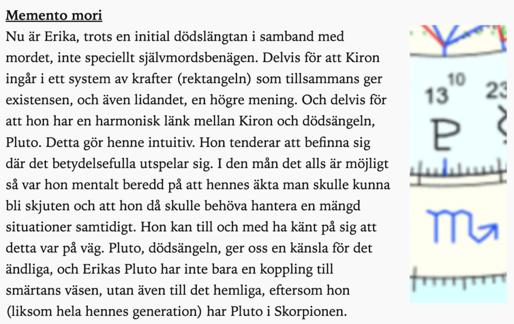 Men först en samvetsfråga. Får man verkligen gå en människa så inpå livet? Alltså går det an? Analyser med denna metod – enkel astrologi, världens äldsta och mest beprövade analysmetod – kan ge inblickar i en annan människas psyke som vederbörandes nära och kära inte ens har anat. Ja, som vederbörande själv inte har koll på. Så, vem är du att ta del av sådan upplysning – och vem är jag att offentliggöra den?