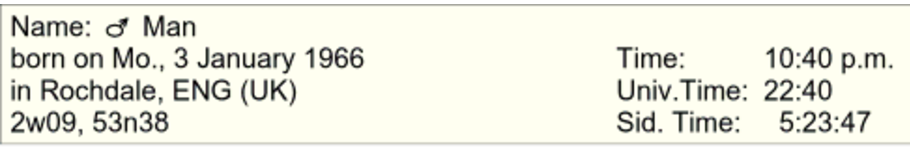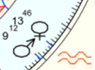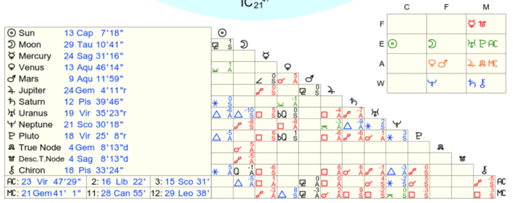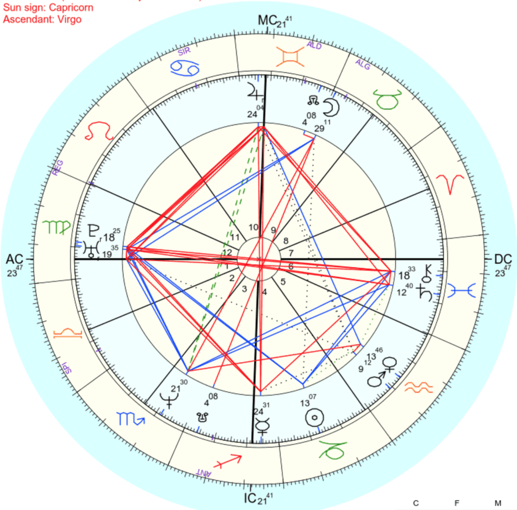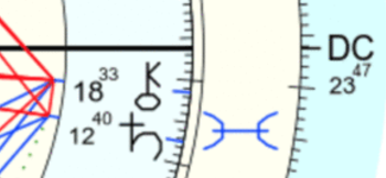 Ah, a Bearer of a Grand Cross! Let’s take a closer look. … Hmm… Quite possibly, what we see here is the basic structure of the astral body of a tortured, perhaps even mad, genius. If he is hetero, one might hope he has a seasoned, understanding, faithful and caring woman by his side. Hetero? Well, the conjunction of Mars and Venus in the 5th House under the Aquarian vault